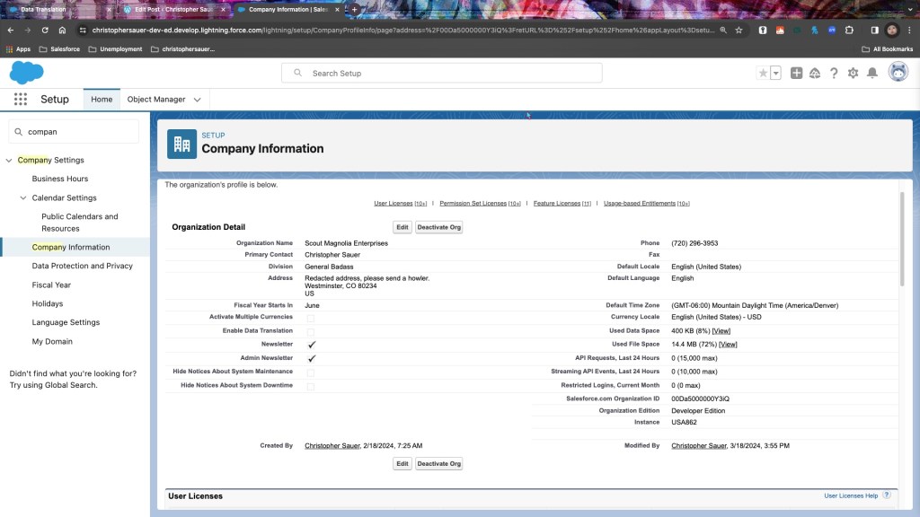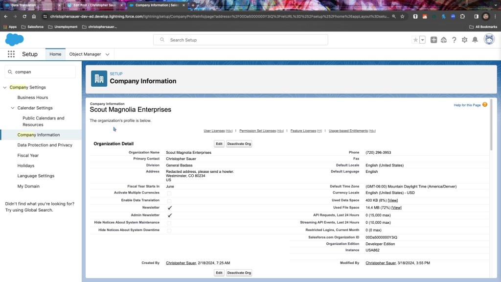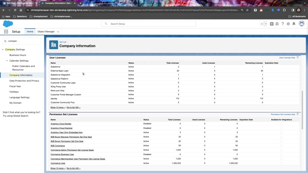 Company Information allows you to present your identity and to broadly monitor and reference it. This topic matters when taking a look into information that may be needed or making sure your org isn’t hitting any limits.